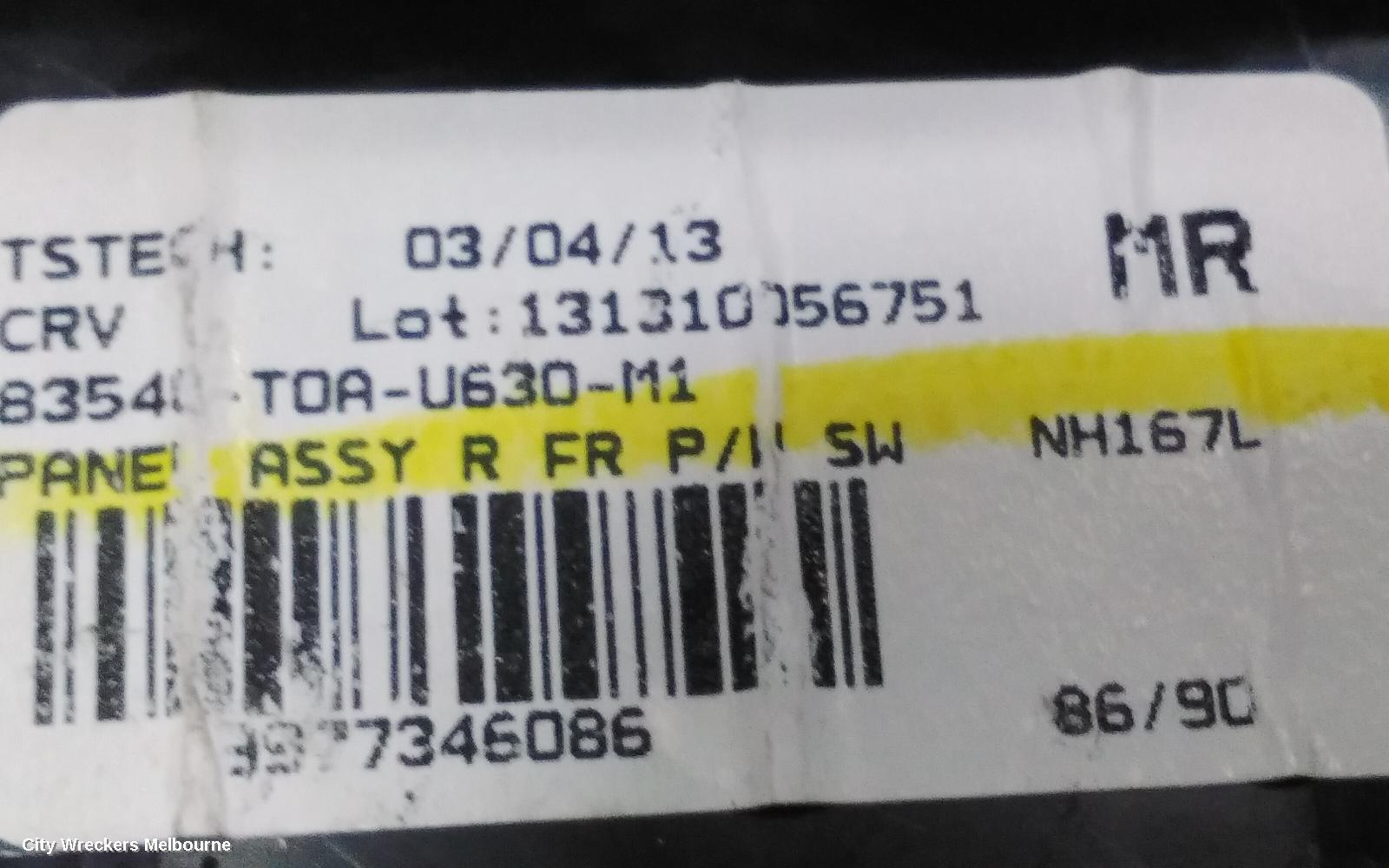 We have for sale a good used Pwr Dr Wind Switch to suit HONDA CRV, RH FRONT (MASTER SWITCH), AUTO DOWN RHF ONLY, RM, 11/12-04/17