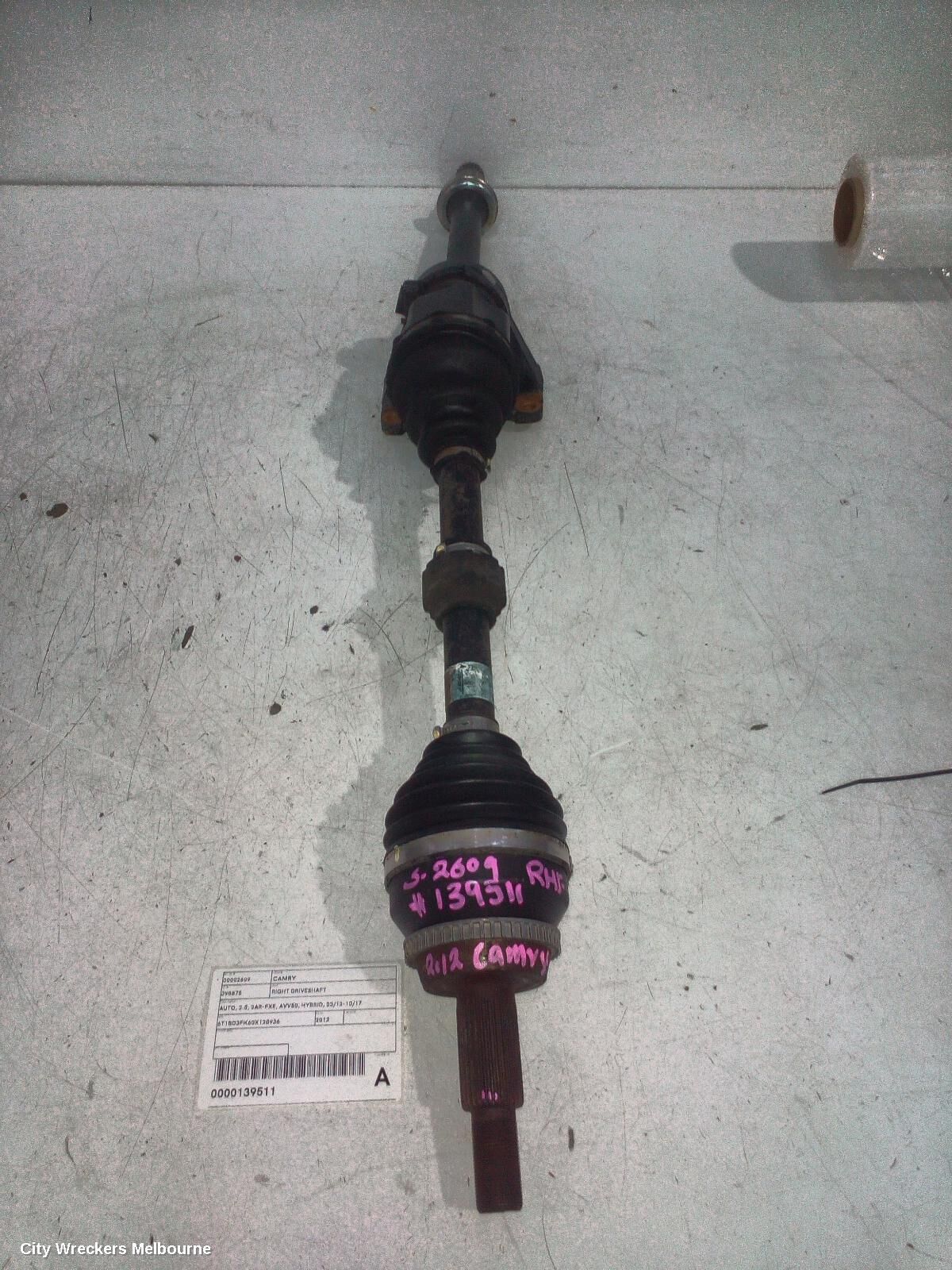We have for sale a good used Right Driveshaft to suit TOYOTA CAMRY, AUTO, 2.5, 2AR-FXE, AVV50, HYBRID, 03/12-10/17